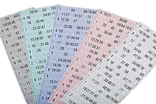 5 series para jugar muchas partidas, vienen de 300 cartones de bingo diferentes sin lineas ni cartones repetidos, 5 colores; blanco, gris, arrebol, verde , lila. Números grandes y claros para leer.