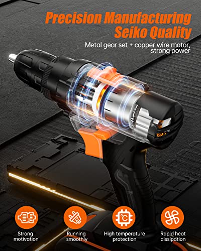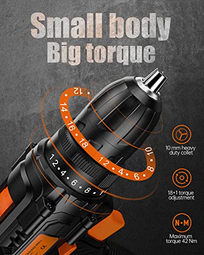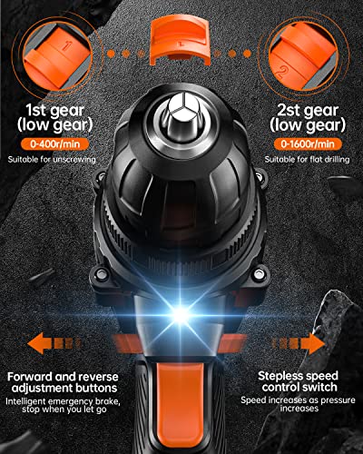 🎄Excelente rendimiento🎄El taladro inalámbrico FFAHEFANA no solo ofrece un ajuste de par de 25+1 y un potente par de 42NM, sino también un accionamiento de dos velocidades (0-400rpm/0-1600rpm) y una aceleración infinitamente variable. El robusto maletín de conducción es portátil y fácil de guardar; la luz LED ilumina toda la zona de trabajo y funciona bien incluso en la oscuridad; el portabrocas autoblocante de 10 mm (3/8″) le ayuda a cambiar las brocas de forma rápida y segura.