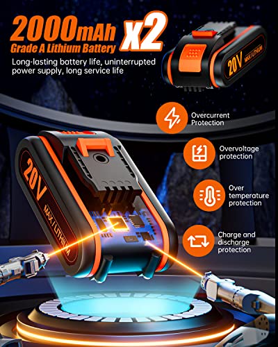 🤶 Batería doble con 2,0Ah de alta capacidad🤶 Proporciona un apoyo de batalla excelente, y con el cargador rápido de 2,0A puedes tener la batería completamente cargada en solo 60 minutos. Puede hacer frente al trabajo continuo de alta intensidad con mayor comodidad y sin tener que comprar pilas de repuesto adicionales. Te ayuda a hacer bricolaje, remodelar cocinas, taladrar puertas y ventanas, montar muebles y otros trabajos profesionales con mayor facilidad.