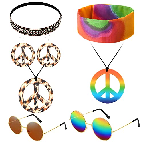 ✨【Conjuntos de disfraces hippie】: recibirás 2 juegos de accesorios de disfraces temáticos de la década de 1970 para hombres y mujeres, incluidos 2 pares de gafas de sol hippie, 2 collares con el signo de la paz, 1 par de aretes con el signo de la paz, 1 diadema de girasol y 1 diadema con teñido anudado. ofreciendo suficiente afluencia y accesorios para crear looks atractivos