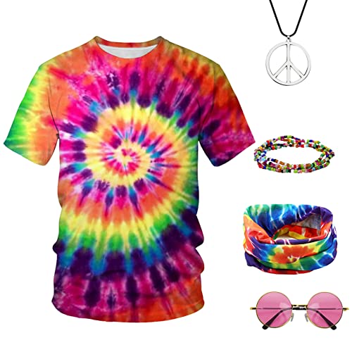 Este juego de ropa hippie incluye: 1 camiseta y 3 accesorios de vestido hippie. Consumido para fiestas hippie o uso fastos.